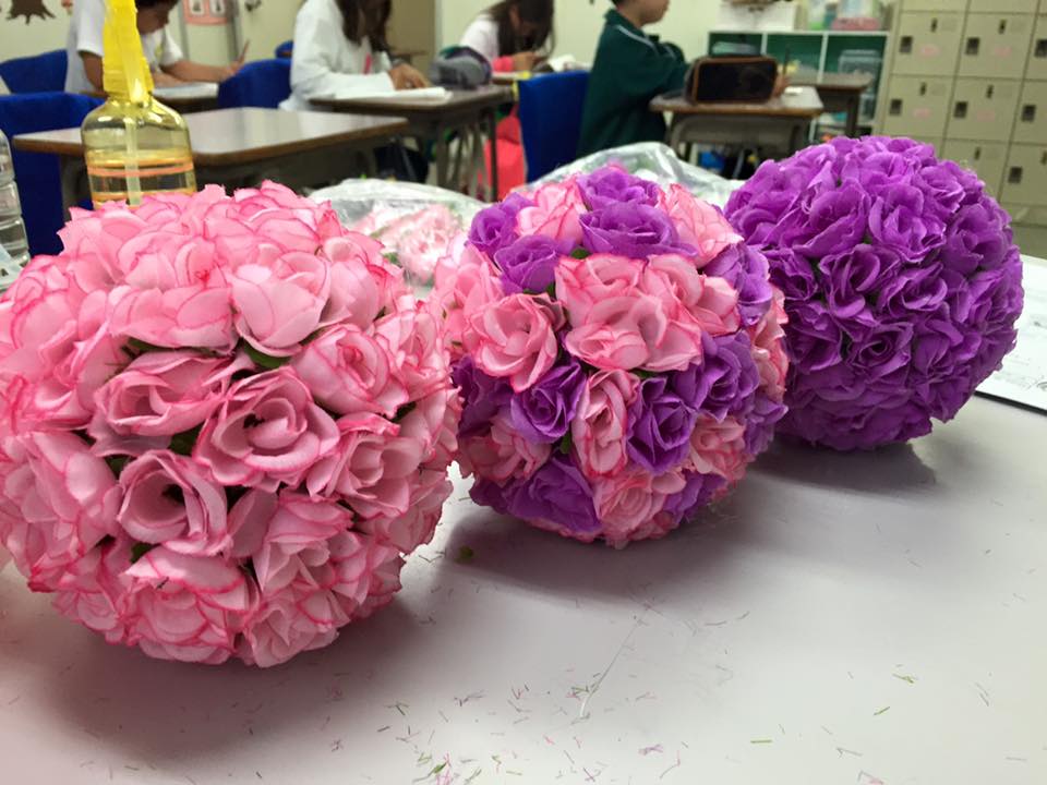 Usei: bola de isopor, cola quente, flores artificiais e fio de naylon com bolinhas.